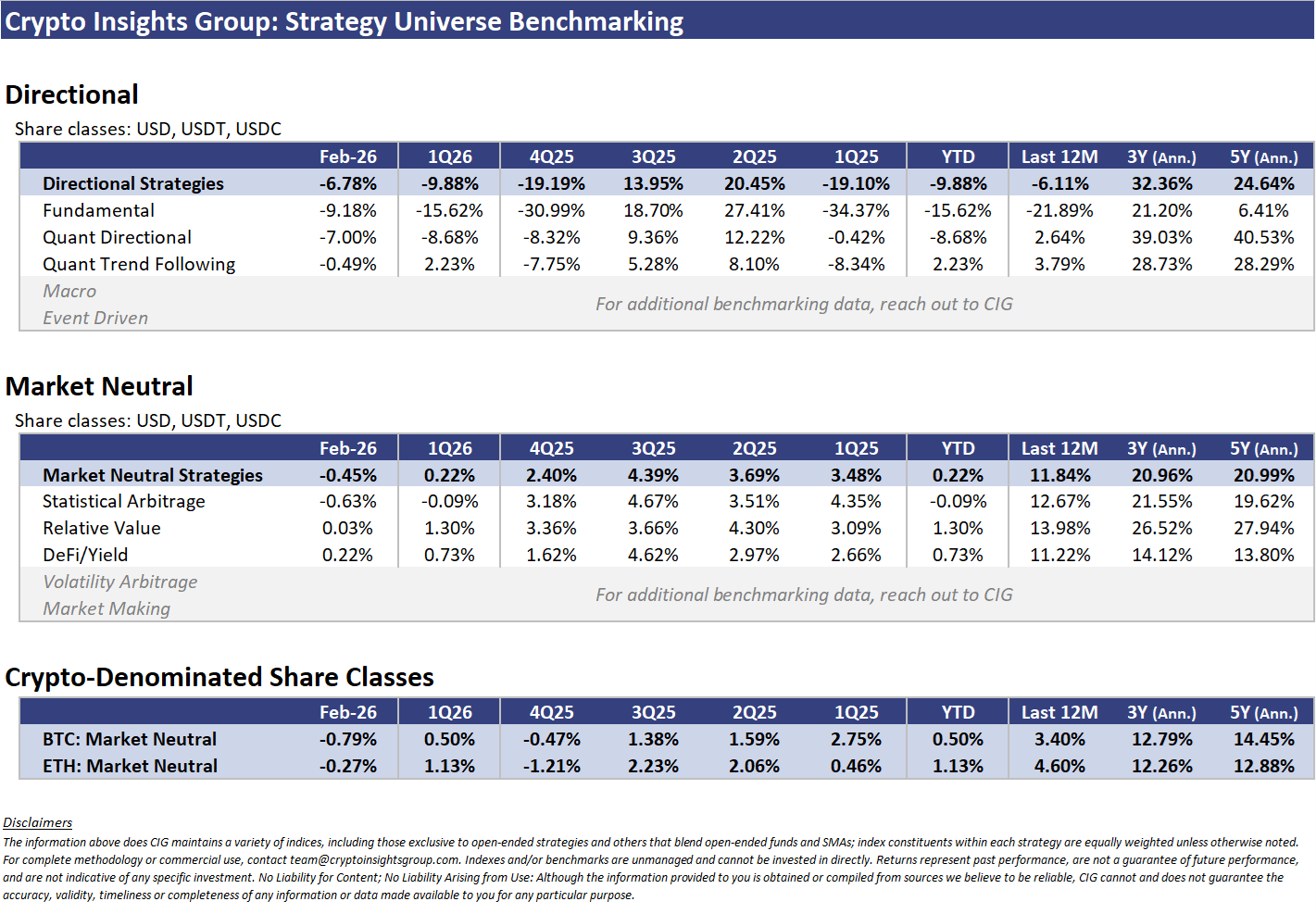 *Monthly returns calculated as of February 28, 2026 and shown net of fees; reflected returns prior to April 2022 are proprietary trading returns that have been pro-forma adjusted to reflect a theoretical 2/20 fee, and no assurance can be given that the fund will continue to follow substantially the same investment strategy; loans were used in trading prior to April 2022. Returns before April 2022 not verified by independent third-party analysis. Past performance is not necessarily indicative of future results. Investments and commodity interest trading involve substantial risks, including risk of loss.